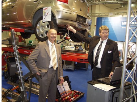 Heinz Schirmer (li.) GS Werkstatteinrichtungen und Ludger Kemmann von CELETTE an dem neuen Karosseriemesssystem NAJA von Celette. |