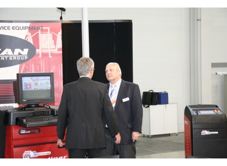 Wolfgang Datum (re.) im Vertrieb bei John Bean und ein Spezi im Bereich der Fahrwerksvermessung. |