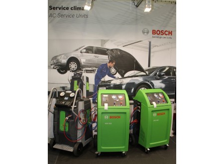 BOSCH präsentierte auf der autopromotec die ersten Klimaservicegeräte aus der gemeinsamen Produktpalette mit SPX ROBINAIR. |