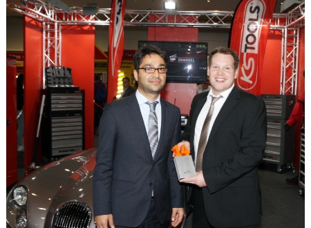 Orhan Altin (li.) und Christian Niebeling KS TOOLS freuten sich über das Kundenvoting zum "schönsten Messestand" auf der TROST Schau 2014. |
