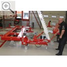 | Die LKW- und Bus-Zugtürme des KOREK HD lassen sich längs und quer in den Bodenrichtrahmen verfahren und dann fest verankern. Zugkräfte von bis zu 23 Tonnen können mit dem KOREK HD angesetzt werden. |