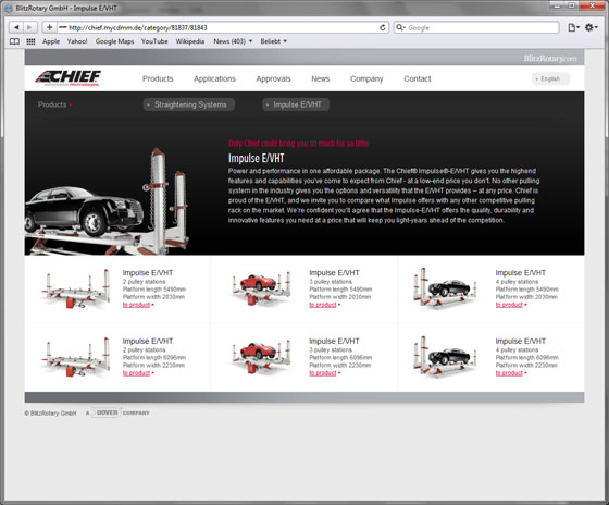 Neben der klassischen Karosseriewerkstatt gibt es zahlreiche weitere Anwendungsumgebungen, in denen Karosserie-Richtsysteme bzw. -Meßsysteme zum Einsatz kommen. Die neue Chief Website stellt für jede dieser Anwendungsumgebungen zielgruppenspezifische Informationen bereit. Im Vordergrund stehen dabei Chief Produktlösungen, deren Verwendung in Form von Videos erklärt wird. Argumente und Nutzen runden die Informationsvielfalt ab. |